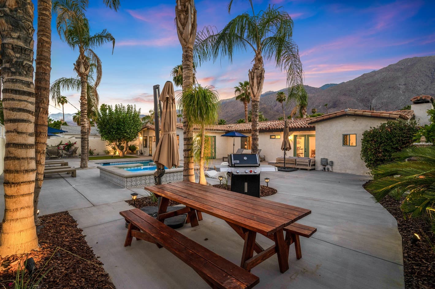 As you enter the backyard, you will find a shaded lounge area, a large PebbleTec salt water pool and spa, a Weber gas grill, and a fire pit area. The spa and pool loungers provide a picture-perfect view of the sunset over the San Jacinto mountains.
