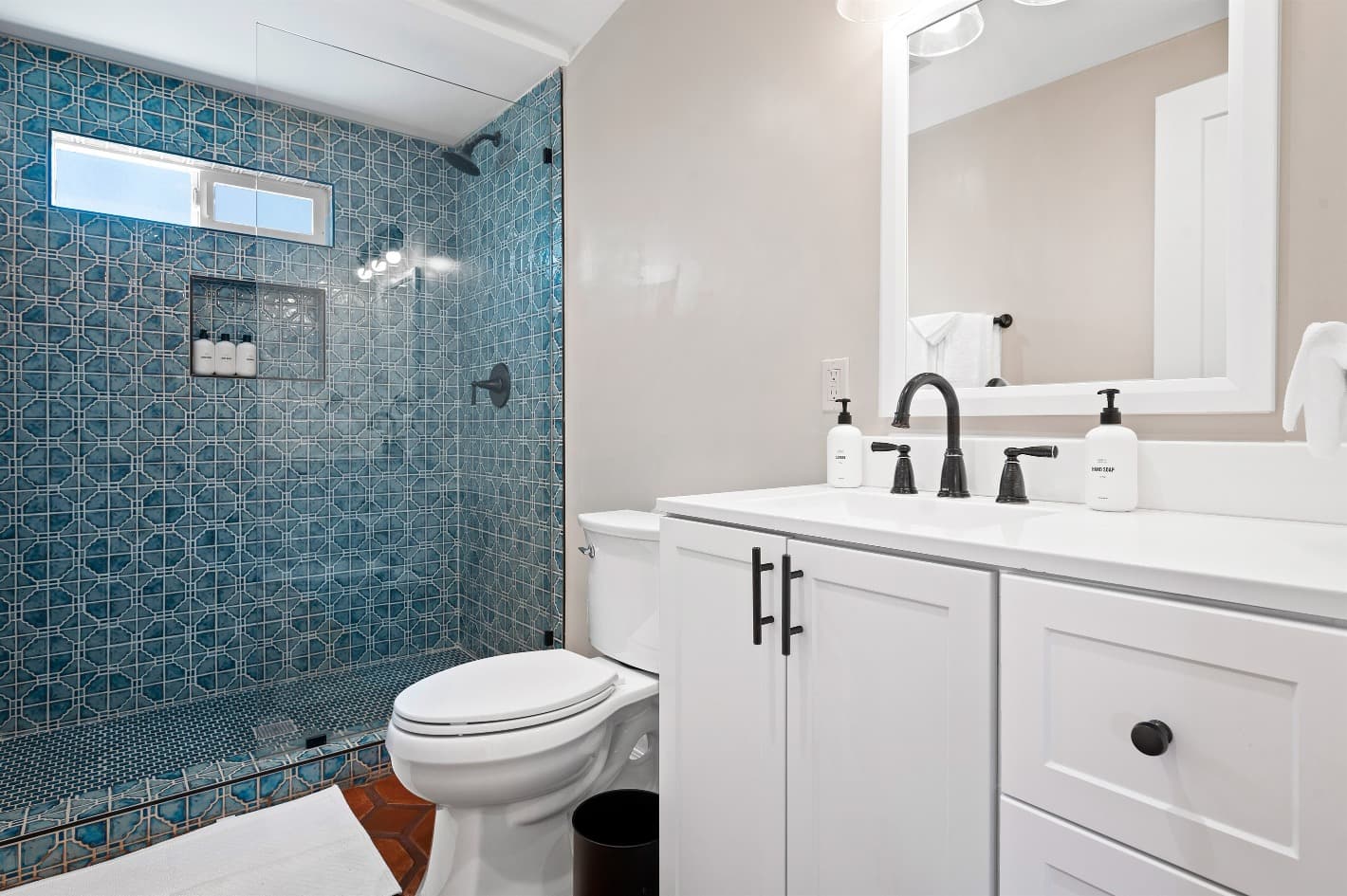 The master bedroom and en-suite bathroom are very private and located off of the living room. All beds are fitted with luxury Brooklinen sheets. From the master bedroom, enjoy private access through a sliding glass door to a charming side patio -- the perfect place to read and enjoy a morning coffee. Two large and one smaller bedrooms share two bathrooms off a hallway from the dining room. Enjoy the hotel quality towels.